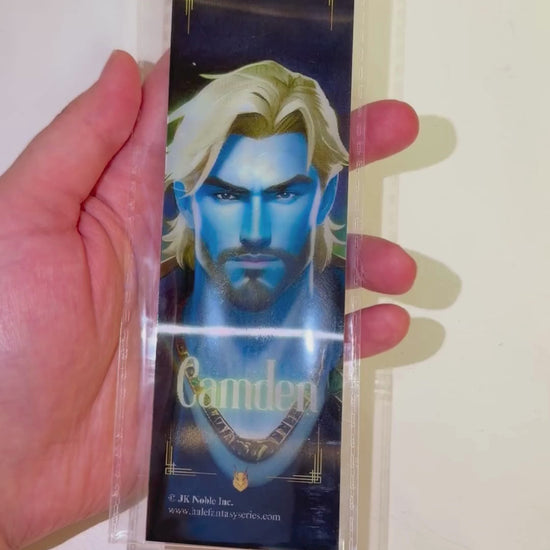 Step into the powerful realm of Bimmorus with the Camden and The Staff of Time Lenticular Bookmark, a striking collectible from J.K. Noble’s Hale series. On the front, Camden — the former prince turned revered General — stands in full command. His regal posture, sharp gaze, and intricately detailed armor reflect the honor, discipline, and inner conflict that define his legacy. Once heir to the throne, Camden now carries the weight of destiny and duty upon his shoulders.